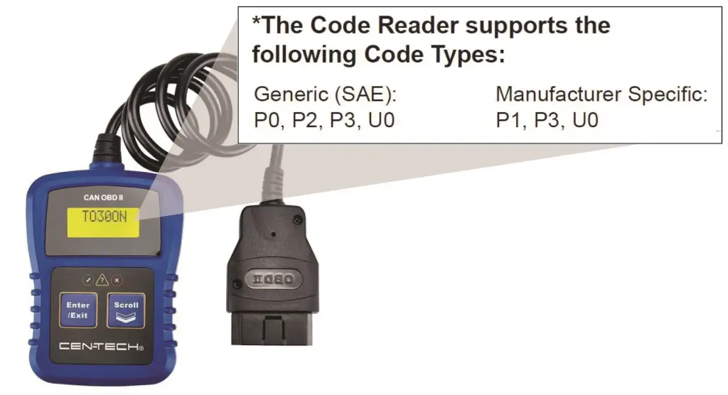 Here’s an example of a $35 code reader from Harbor Freight. I’ve downloaded the user’s manual and clipped out the relevant section to show exactly which codes it can read. Notice that it can read Generic codes and manufacturer-specific P1000, P3000, and U0000 series trouble codes. However, it can’t read any Body (B), or Chassis (C) codes and the device doesn’t have any way to update.