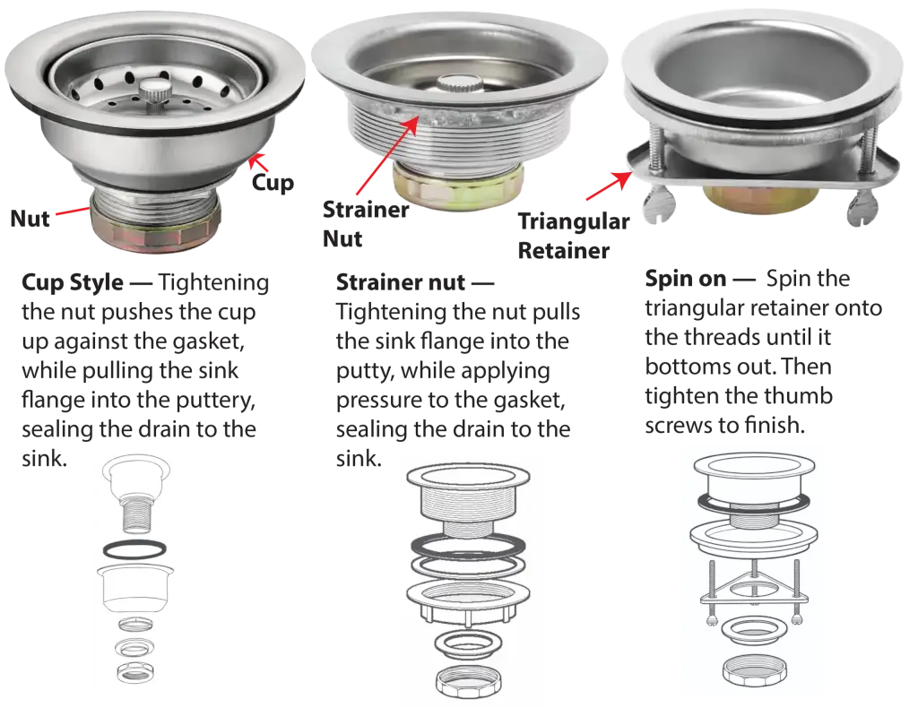 Cup style — Pro: Faster and easier to install than the strainer nut style because the nut is much smaller. Press the sink flange into the putty. Install the rubber gasket and cup, and screw on the nut.