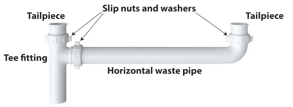 will be an additional component called the continuous waste pipe. This pipe connects the two sink drains together before the water reaches the trap. The assembly typically includes: