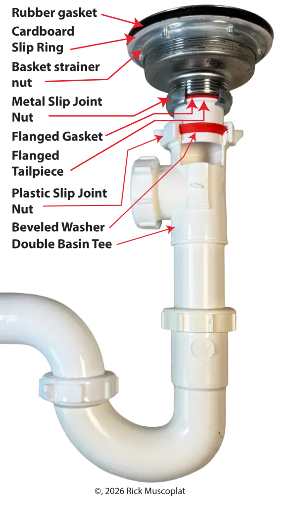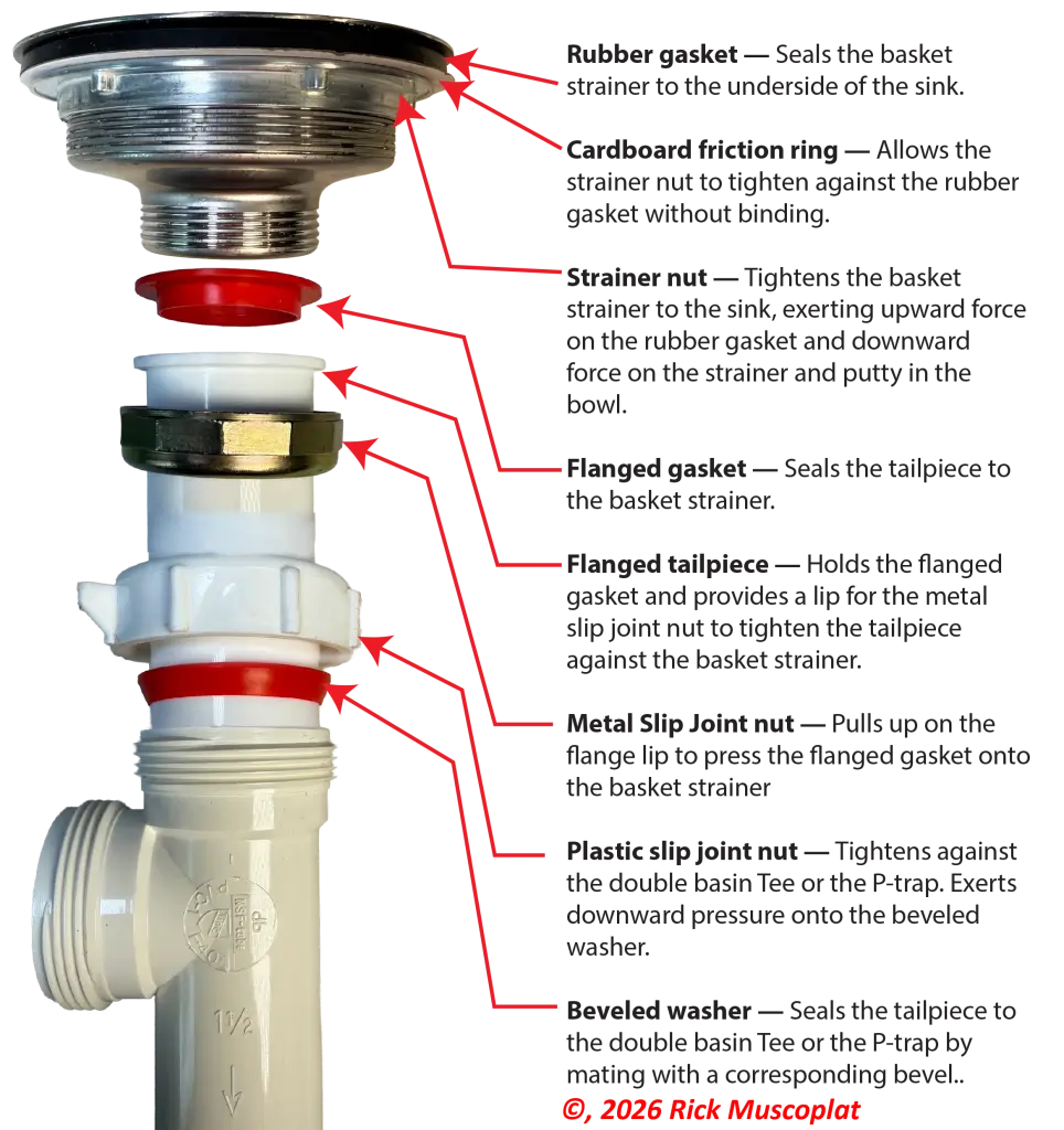 From the basket strainer and tailpiece to the P-trap and trap arm, every component serves a specific purpose. When one part fails, leaks often develop at predictable spots, such as slip joints or gasket connections.