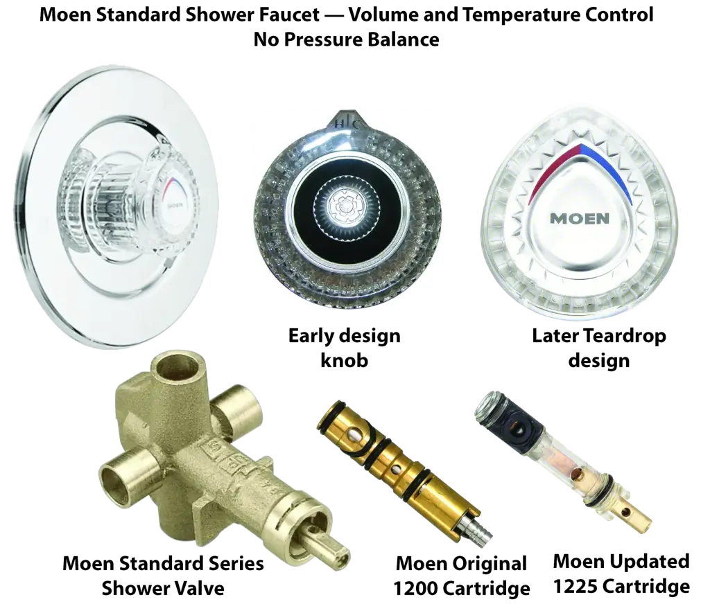 Moen standard series shower faucet. The plastic knobs in the standard series can point in any direction when the water is shut off. That’s a distinguishing feature from the Posit-Temp series faucet, where the teardrop knob always faces DOWN when the water is off.