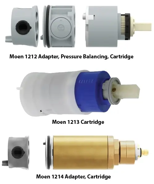 rather than one universal design. The most common are the 1212 cartridge (2-Series), 1213 cartridge (3-Series), and 1214 cartridge (4-Series), all of which use a pressure-balancing “puck” and built-in check valves to regulate hot and cold flow. These cartridges control both mixing and flow, depending on the model, which is a departure from older Moen valves, where the cartridge did everything in a single format.