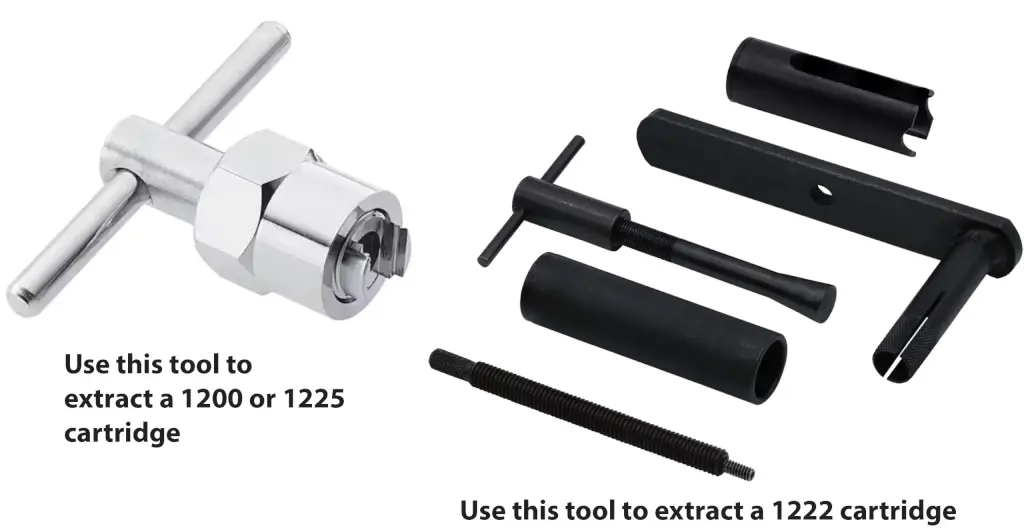 Removing the cartridge is the most difficult part of the repair, and I strongly recommend buying the right removal tool. The standard T-handle puller shown below works fine with most 1200 and 1225 cartridges. But it does NOT work well with the Posi-Temp 1222 cartridge. The 1222 tends to get stuck and not rotate. I only use the ONA Puller Premier Moen Cartridge Extractor Tool ($80 on Amazon). Amazon sells less expensive copycat versions. The cheaper tools are great for people who love to save a buck and don’t mind spending the entire day doing a job that can be done in 5 minutes with the more expensive tool. Get the point?