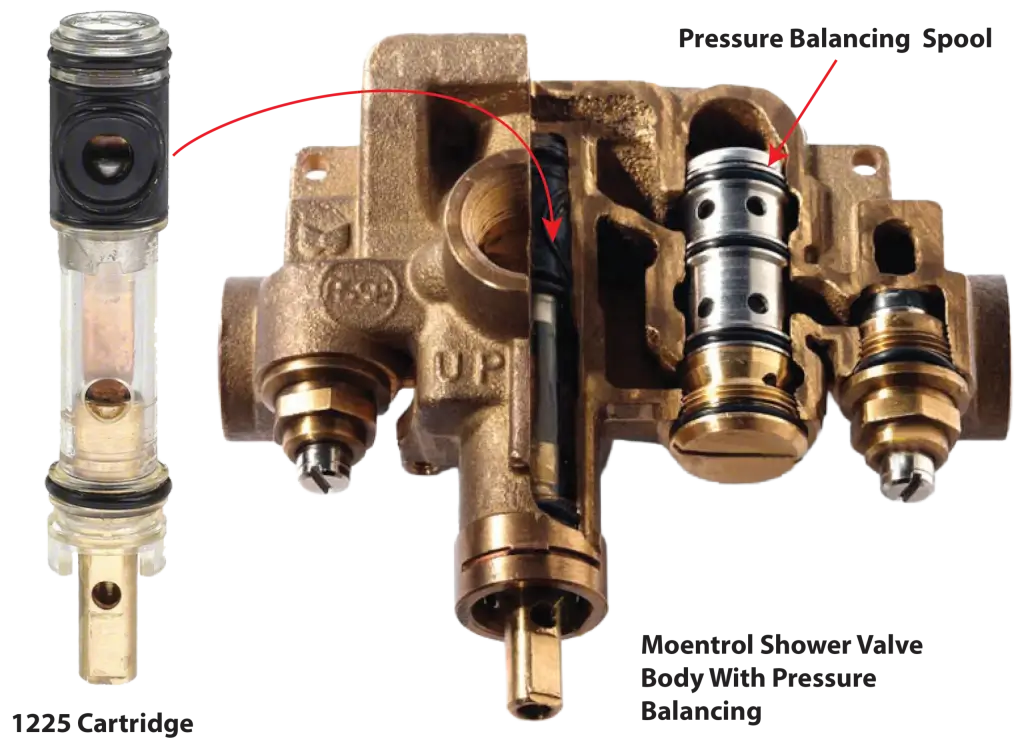 Cutaway view of the moentrol shower valve showing the 1225 cartridge and the pressure balancing spool valve.