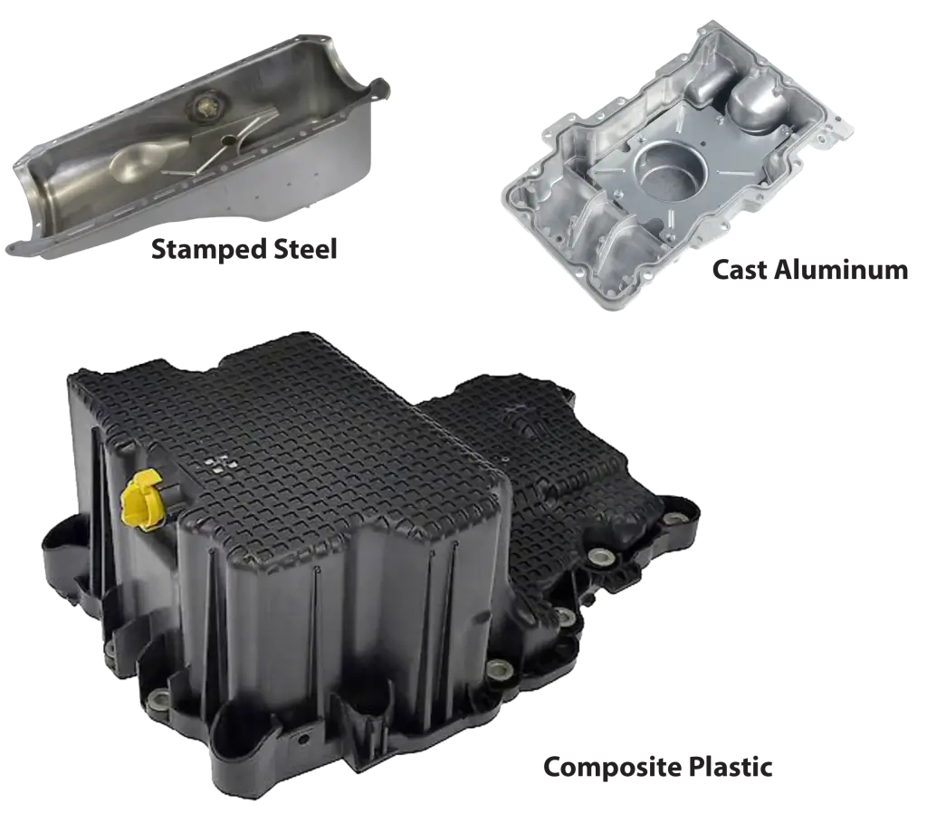 Composite or Plastic Oil Pans — Some modern engines now use molded composite pans. These are surprisingly strong and extremely lightweight. Plastic pans also allow manufacturers to mold complex shapes, integrate oil baffles, and reduce manufacturing costs.