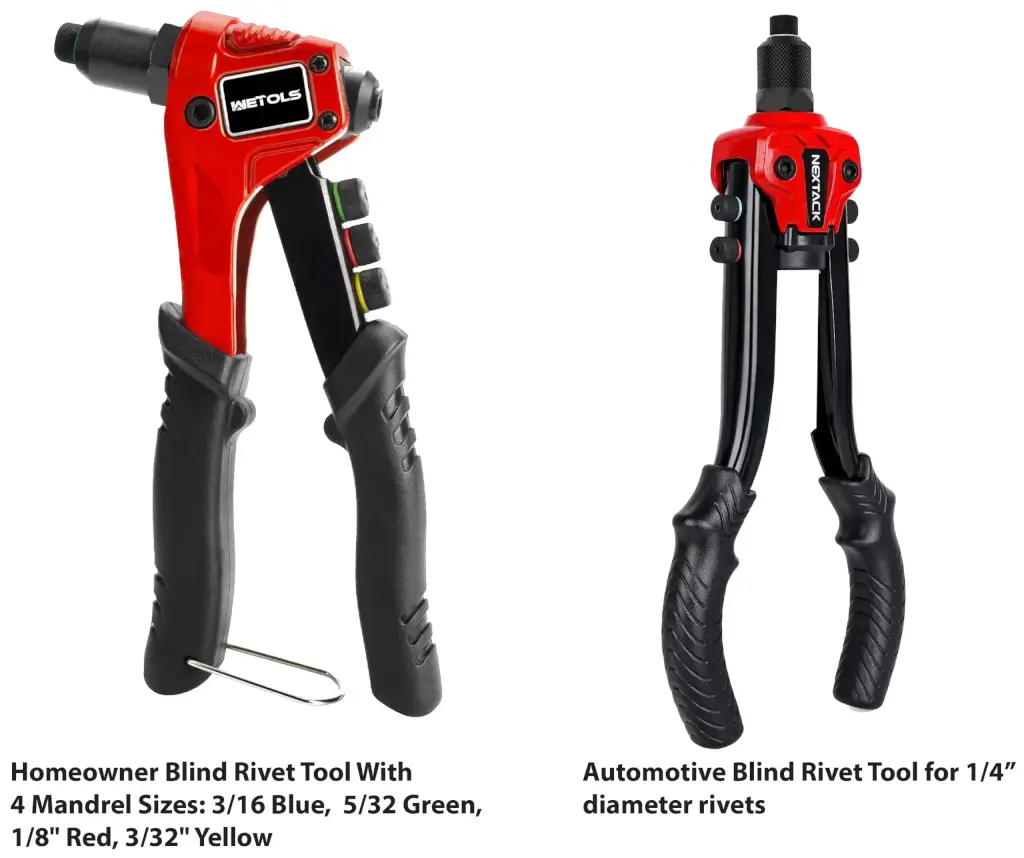 A homeowner’s blind rivet tool usually comes with several mandrel adapters, like 3/16″,