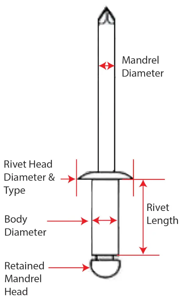 2. Rivet Length Versus Grip Range— The grip range is the total thickness of the materials the rivet can secure. It is not the same as the rivet’s length because you must allow enough room for the mandrel head to expand and compress the material.