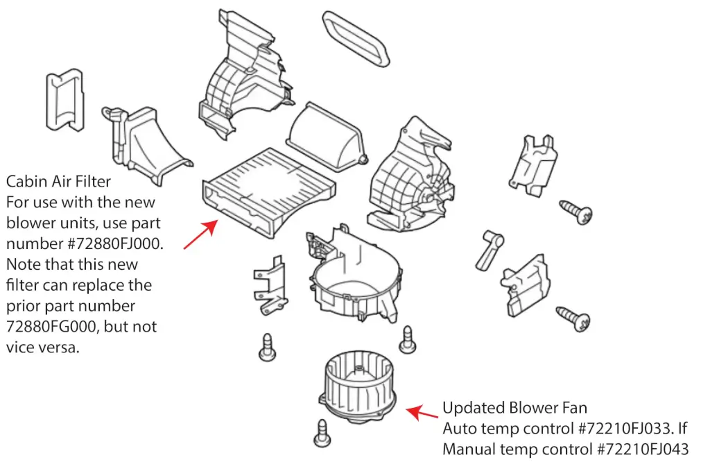 Updated Cabin Air Filter: For use with the new blower units, use part number 72880FJ000. Note that this new filter can replace the prior part number 72880FG000, but not vice versa.