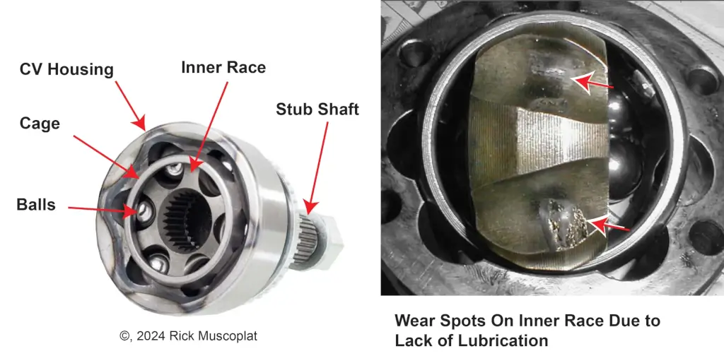 The image on the left shows the components of a CV joint. The image on the right shows wear spots on the inner race of the CV joint. These wear spots can cause a popping sound when turning. slowly
