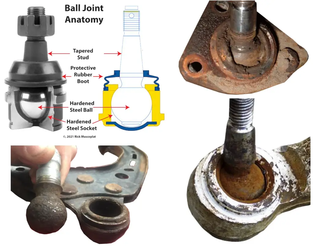 Ball Joints— Ball joints connect the control arms to the steering knuckles and allow for smooth movement of the suspension. When they wear out, they can produce popping or clunking noises, particularly when turning or going over bumps.