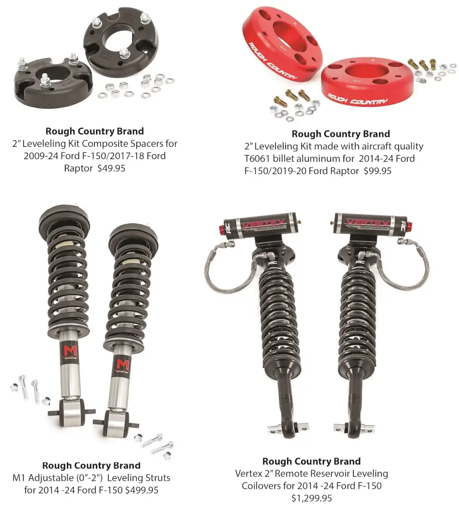This is just a sampling of leveling kits for a Ford F-150 truck from supplier Rough Country (www.roughcountry.com). Starting at the upper left, see their inexpensive composite spacers. To the right, you’ll see their billet aluminum spacers. At the bottom, you’ll see some of Rough Country’s mechanically and pneumatically adjustable coilovers. The mechanically adjustable coilovers allow you to adjust ride height from 0″ to 2″. The pneumatically adjustable coilovers allow you to adjust ride height and comfort.