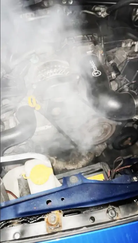 2)Power steering fluid leak from power steering hose— A leak in a power steering fluid line can also cause a car smoking from under the hood condition. This happens when the fluid lands on hot engine parts and burns. Check your power steering fluid level.