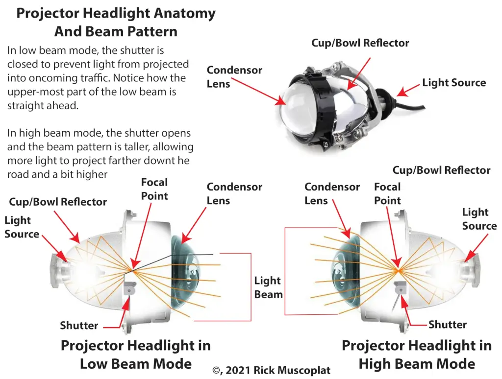 Projector Headlights — A projector headlight uses an elliptical reflector to focus light from the bulb to a precise focal point just in front of a cutoff shield, which blocks upward-scattered light and creates a sharp horizontal cutoff. A convex lens then magnifies and projects this shaped beam onto the road, producing a bright, focused, and highly controlled light pattern. This system delivers better beam precision than reflector headlights, but only when the correct bulb type—halogen, HID, or OEM LED—is used in the housing it was designed for.
