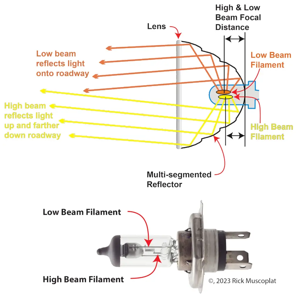 Reflector Headlights — In a reflector housing, the filament sits precisely at the parabolic focal point. Because halogen filaments emit light in 360°, the reflector can gather and redistribute the light into a controlled beam.